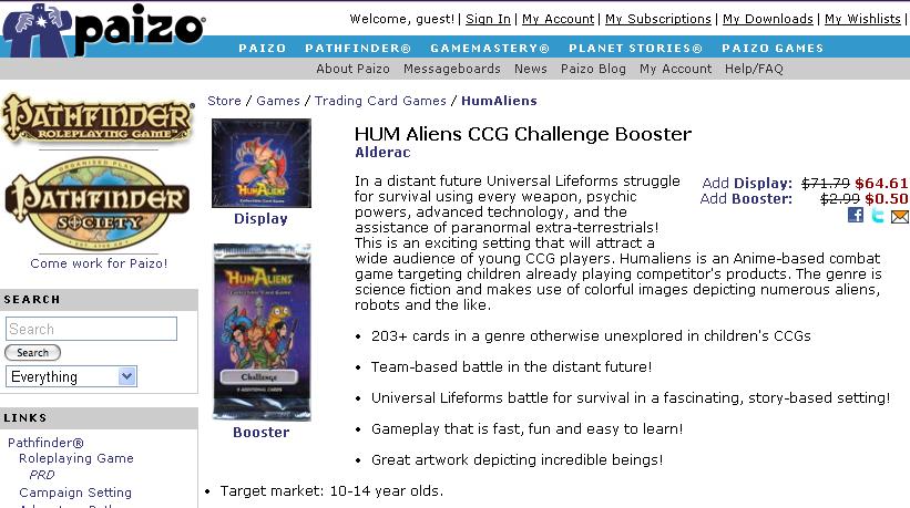 In a distant future Universal Lifeforms struggle for survival using every weapon, psychic powers, advanced technology, and the assistance of paranormal extra-terrestrials! This is an exciting setting that will attract a wide audience of young CCG players. Humaliens is an Anime-based combat game targeting children already playing competitor's products. The genre is science fiction and makes use of colorful images depicting numerous aliens, robots and the like.